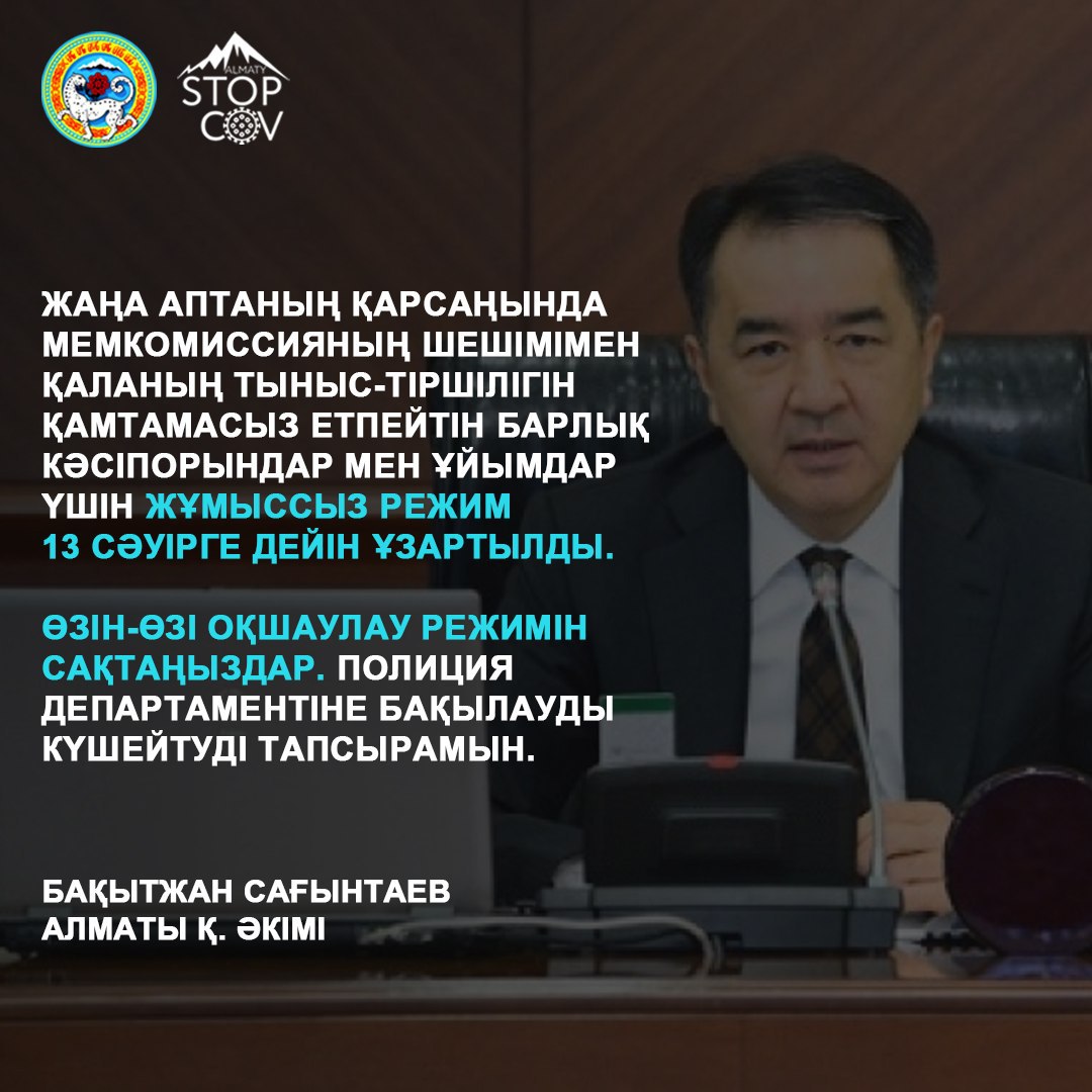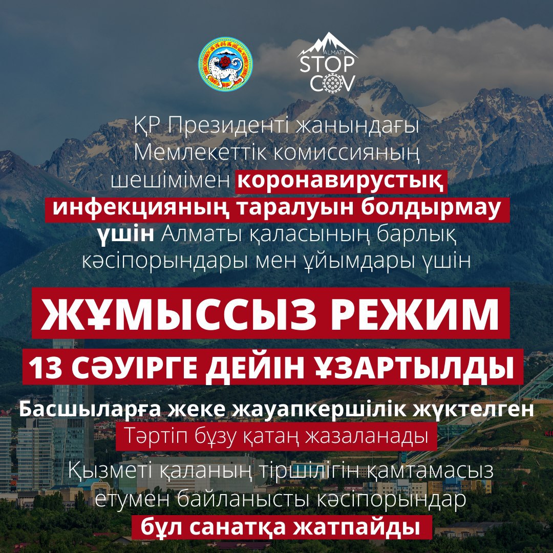 Алматыда күшейтілген карантин режимі 2020 жылдың 13 сәуіріне дейін ұзартылды .