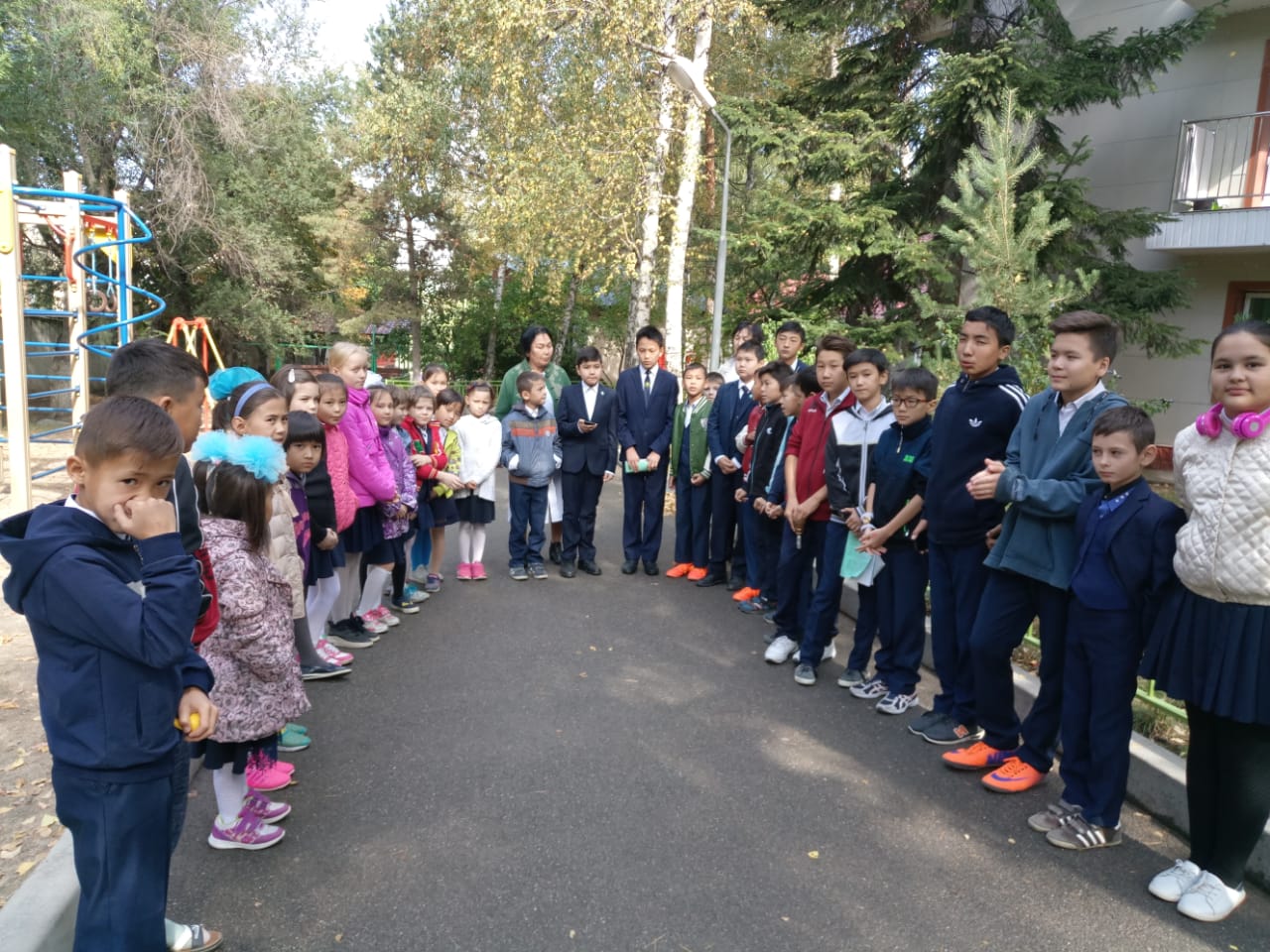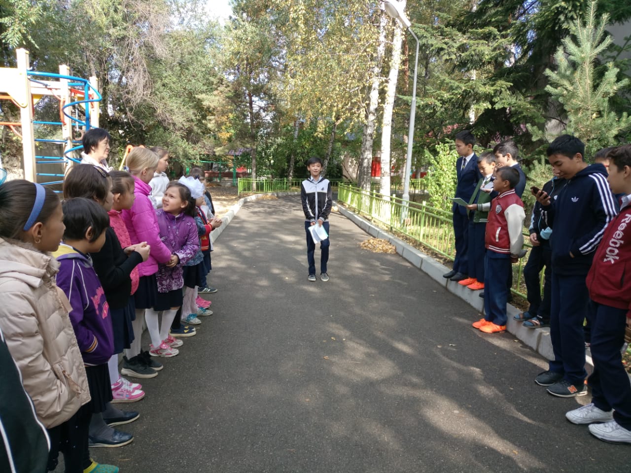 Сегодня дети ко дню Языка читали стихи на казахском, на русском и на английском языках. Пели песни на казахском языке, посвящённый Дню языка и прошло это мероприятие на свежем воздухе.