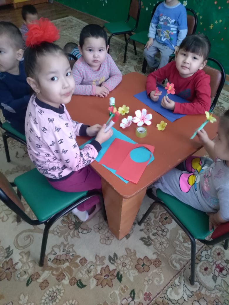КГП на ПХВ «Детский реабилитационный центр фтизиопульмонология»  в младшей группе малыши вместе с воспитателем своими руками готовят подарки мамам.